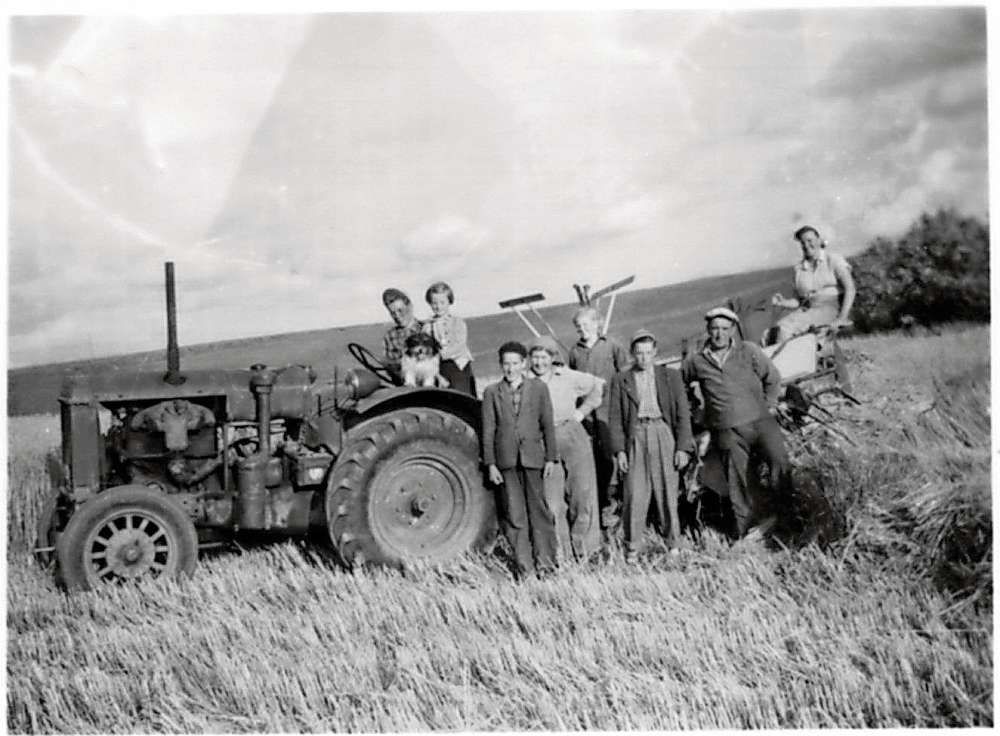 År 1951 hade vi flyttat från en mindre gård till Enekulla utanför Skurup i Skåne. På lilla gården räckte det med två hästar, men nu inköptes en röd traktor av märket Deering. Vi ungar var så imponerade. Det fanns även järnhjul till den som behövdes vid plöjning. På bilden drar traktorn självbindaren.