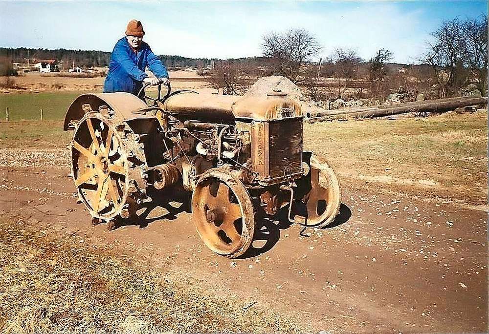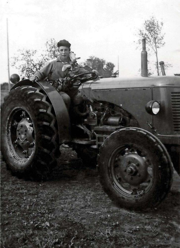 Här står min man Göran Andersson på en traktor som han fick av en granne. Märket på traktorn är Fordson. Både traktorn och min man är ”födda” år 1938. Vi bodde i Fullmestad, Rimforsa, i Östergötland.