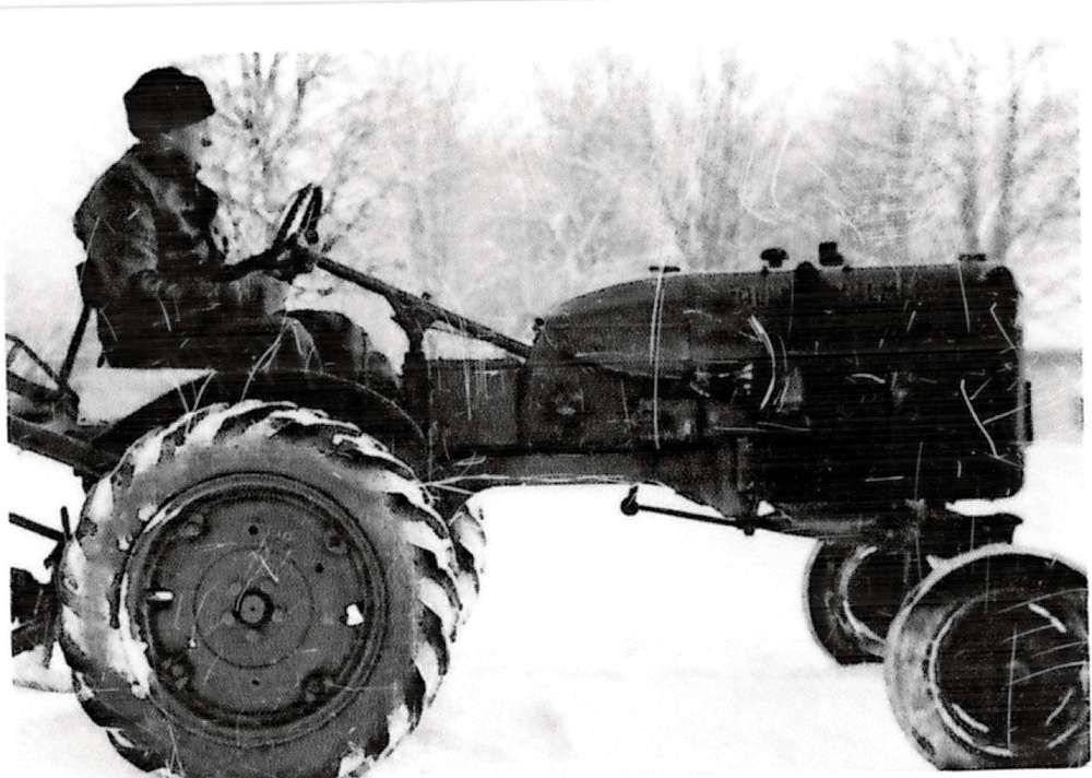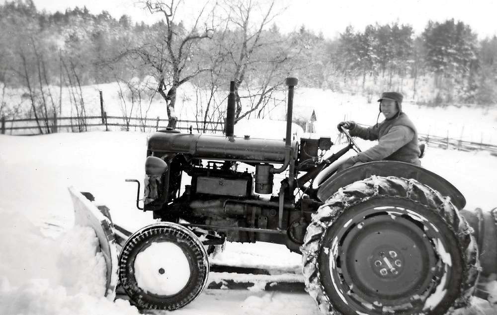Martin Pettersson röjer snö med en Ford Major -traktor 1958 i Hökhult, Horn, i Östergötland. Byborna köpte traktorn och bildade ett gemensamt bolag. Sedan fick man betala en timkostnad vid användningen av traktorn. Jag är född och uppväxt i byn. På den tiden var det många boende där. Nu är det bara min mor som är fastboende.