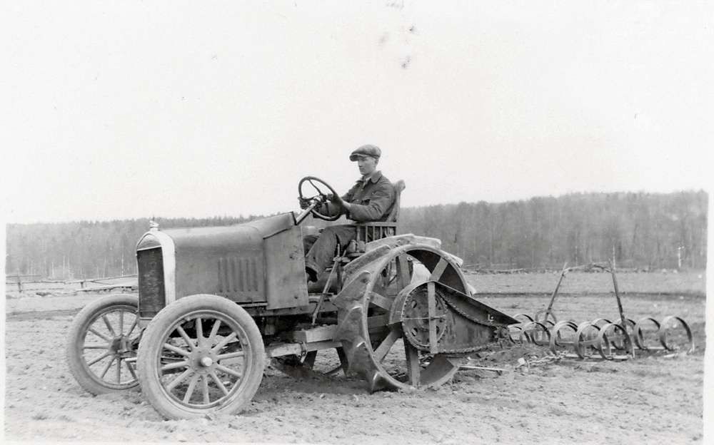 Bilden är tagen sannolikt på 1930-talet. Mannen är för mig okänd eftersom jag hittade bilden i en låda efter min mamma. Platsen är troligen Trönö i Hälsingland. Är det någon läsare som kan se vad det är för traktor? Är det kanske ett hemmabygge?