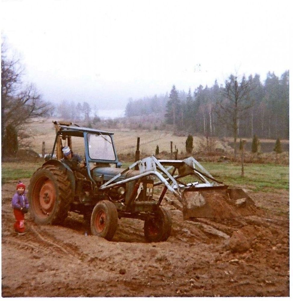 Våren 1977 är det markarbete igång i Farsbo, Kisa, i Östergötland. Håkan Sandberg rattar en Fordson Major -56 och Fredrik Sandberg står bredvid.