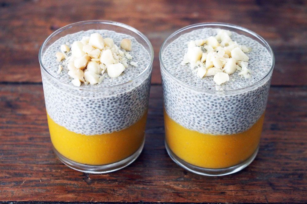 3. Häll chiamjölken försiktigt över mangon och ställ i kylen i minst 4 timmar.