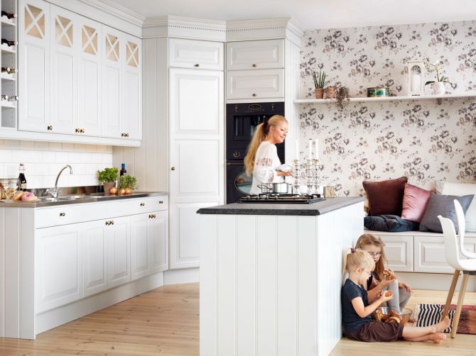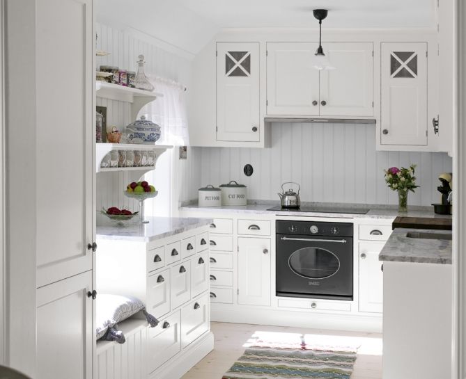6. Dunvita luckan Broby från Kvänum. Tillsammans med skålhandtag, krysspröjsade överskåp och pärlspont får det här köket en härlig känsla. Foto: Kvänum.