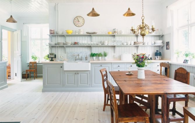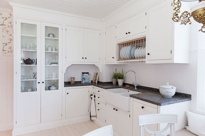 9. Fina köket Forsby i färgen dunvit från Kvänum tillsammans med bänkskiva i kalksten och franska porslinsknoppar gör det här köket till ett riktigt drömkök. Foto: Kvänum.