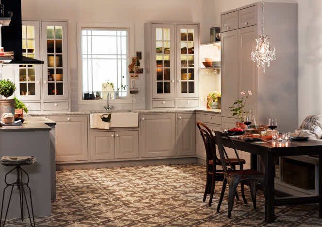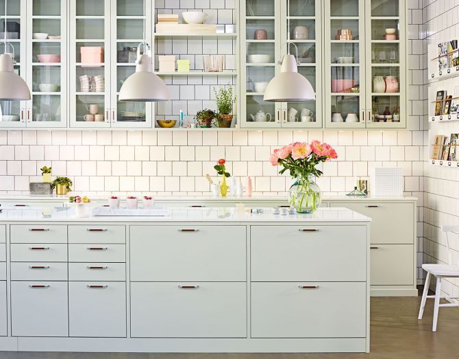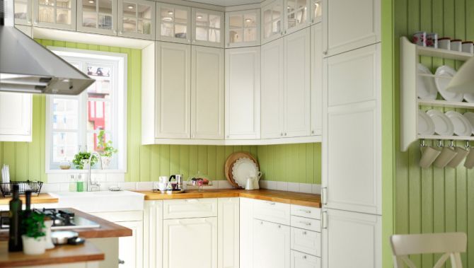 5. Kök med luckan Bodbyn från Ikea där väggarna är målade i en ljusgrön kulör. Och bara ett litet stänkskydd i form av en kakelrad. Ett kök med mycket lantlig känsla. Foto: Ikea.