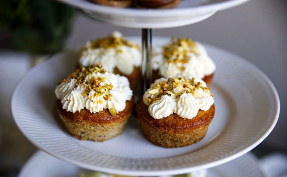 6. Dekorera muffinsen med frostingen och strö hackade pistagenötter ovanpå.