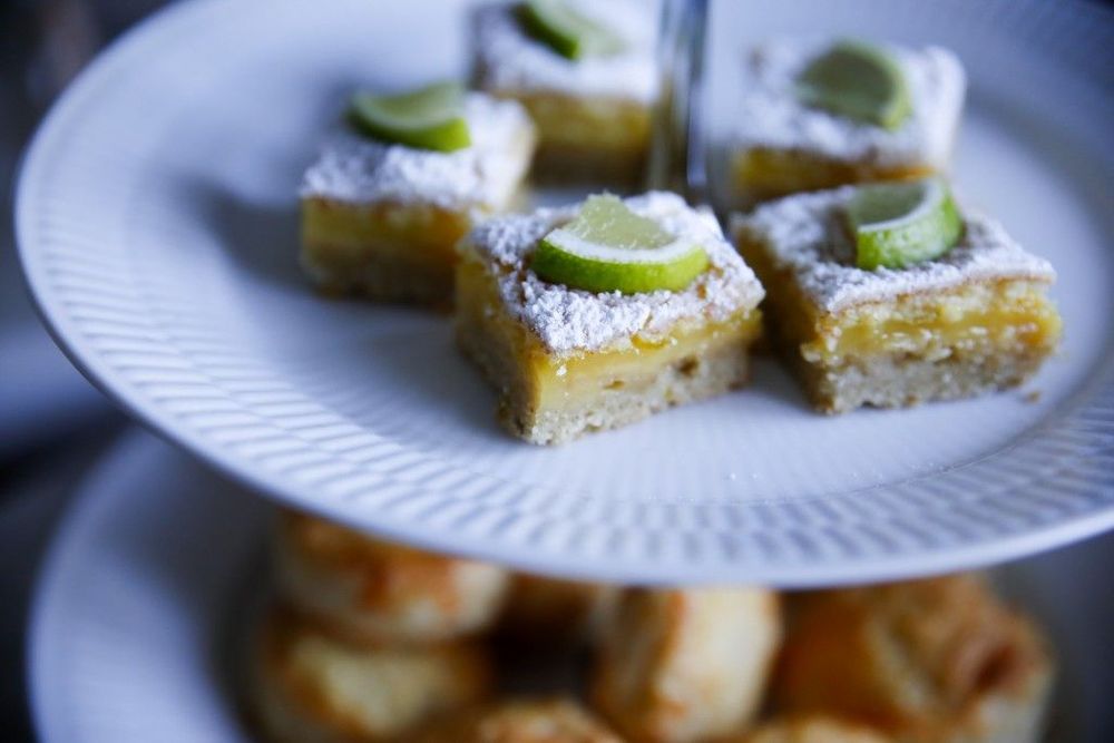 7. Skär upp kakan i rutor och garnera med en liten limeklyfta.
