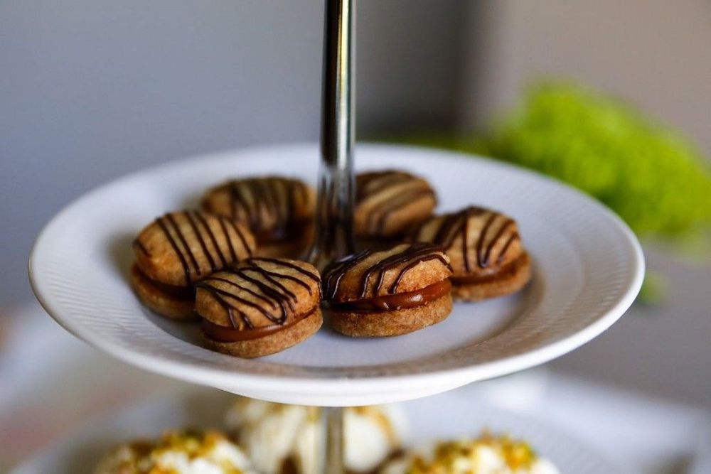 5. Klicka ut en liten klick dulce de leche på botten av hälften av kakorna, ta en kaka och tryck ihop till en dubbelmacka.