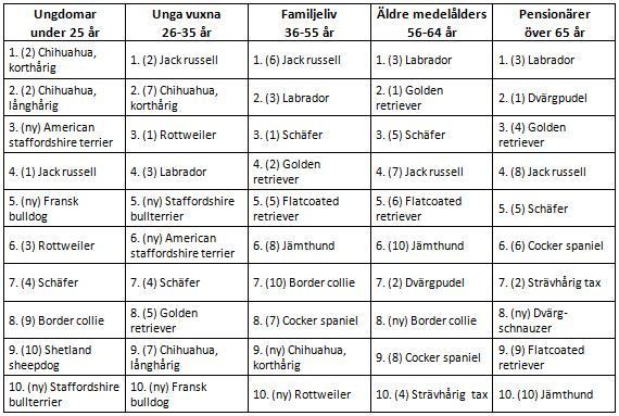 Unga föredrar främst små hundar, medan de större raserna labrador, golden retriever och schäfer dominerar i åldersgrupperna över 55 år.
