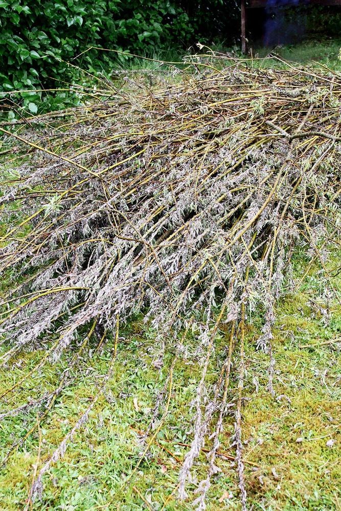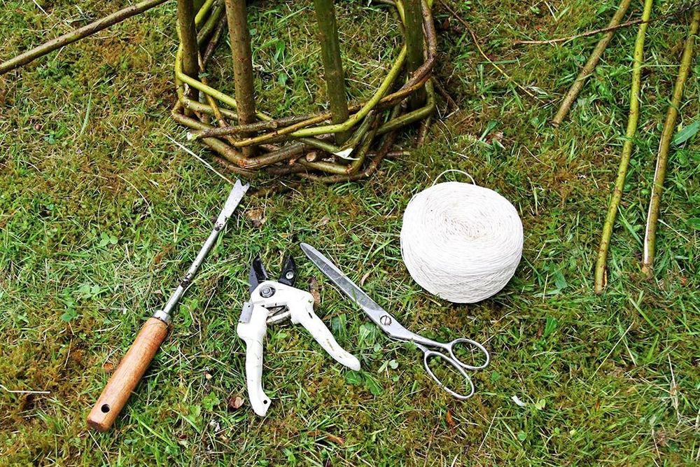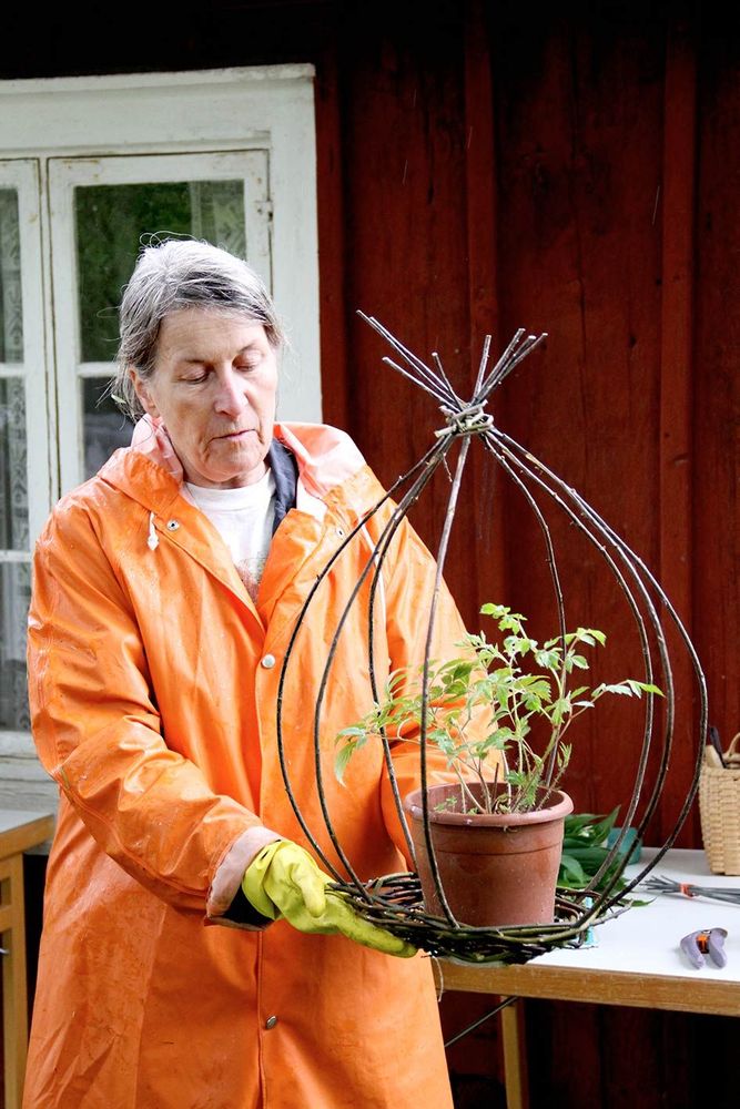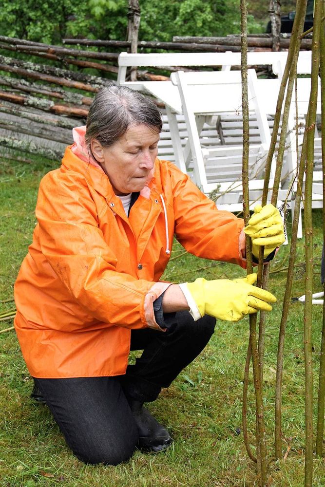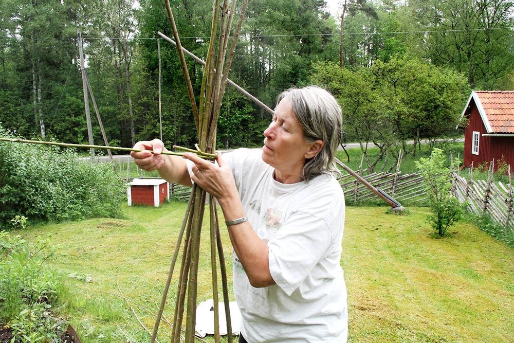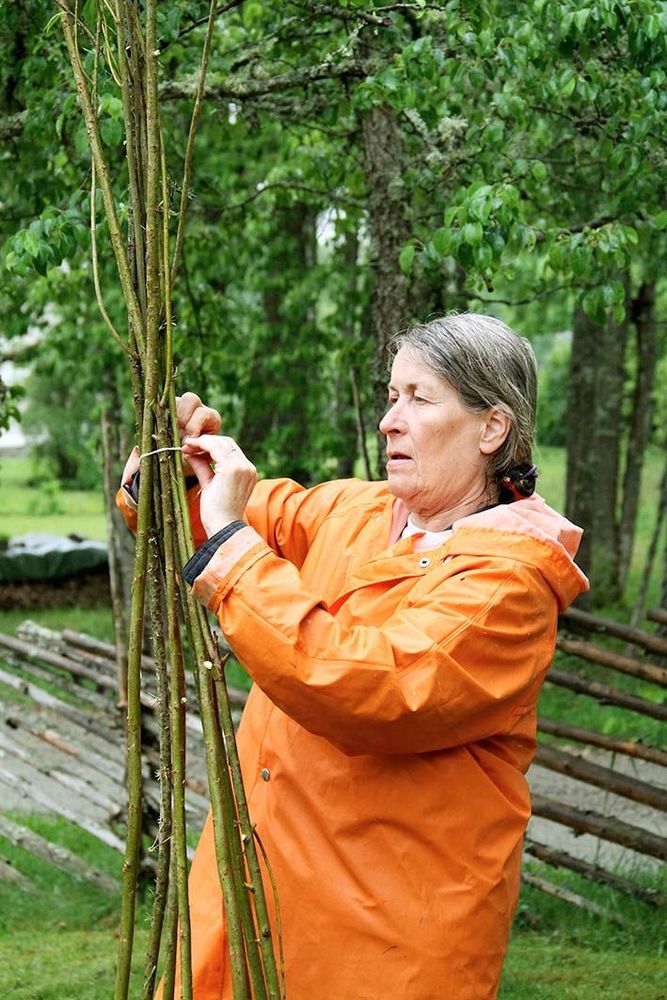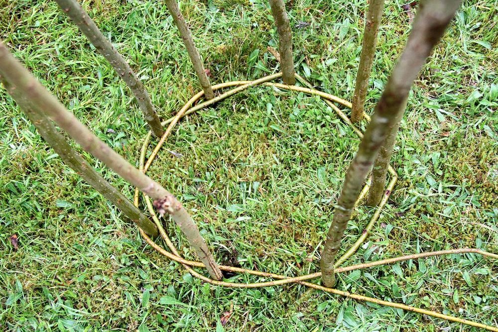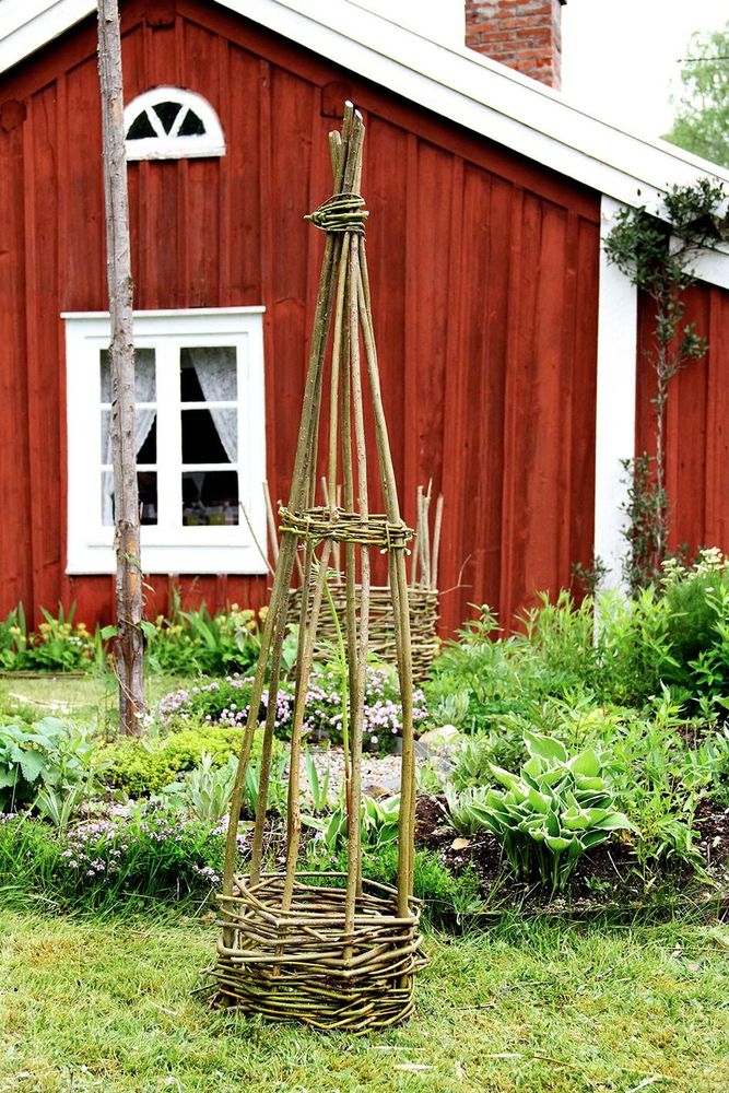 - Ett ojämnt antal (fem, sju, nio eller elva) grövre och ganska raka vidjor till stöttor. Antalet beror på hur stor kon du tänker göra.