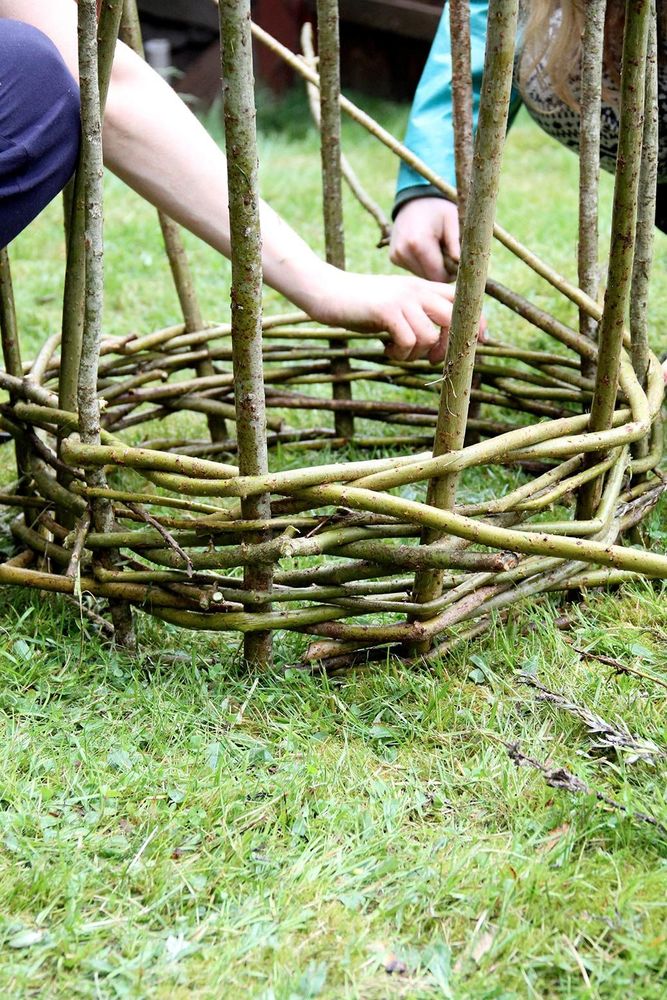 3. Börja fläta nerifrån, alldeles tätt invid marken, med slanans tjockända. Varannan framför, varannan bakom stöttorna. Pressa ner mot marken så att det blir tätt och snyggt. Pilen krymper nämligen när den torkar.