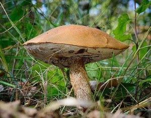 Svampen kallas också stensopp och finns över hela Sverige. Foten ljusbrun med ett vitt ådernät.