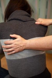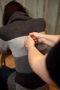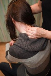 Lägg händerna på axlarnas mjuka del, nära halsen och börja mjukt knåda med handlovarna och mjuka fingrar, formade som en skål. Knip inte hårt. Massera inifrån halsen och ut mot axeln och upprepa.