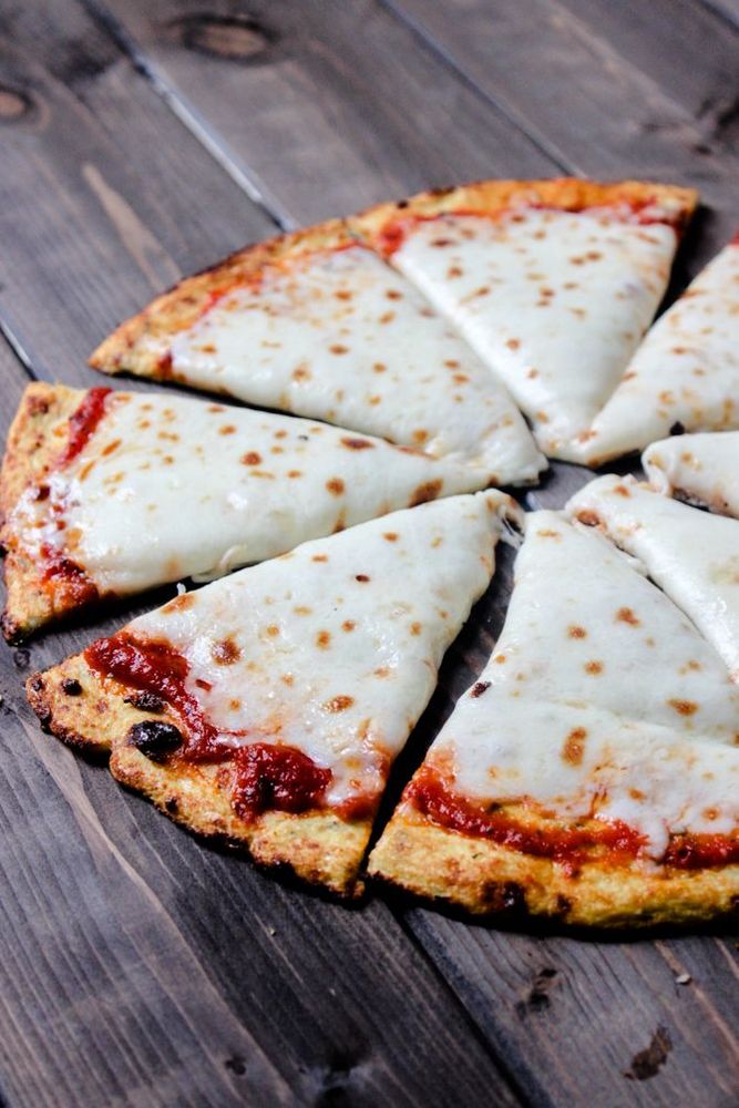 Bryt blomkålen i buketter. Mixa dem i en matberedare tills blomkålen är finhackad. Riv mozzarellan i små strimlor och riv parmesanosten. Fräs blomkål och vitlök i olivolja i en stekpanna i 5 minuter. Låt svalna något. Vispa äggen lätt och blande dem väl med blomkål, mozzarella, parmesan och kryddor. Bred ut blandningen på bakplåtspapper och grädda i mitten av ugnen i cirka 15 minuter eller till blomkålen börjar få färg.