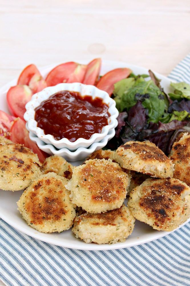 Dela blomkålen i buketter och koka den tills den är mjuk nog att mosa med en gaffel. Kläm ur all vätska ur blomkålen. Blanda blomkål, salt, kryddor, ströbröd, ägg, mozzarella och riven cheddar tills en boll bildas. Forma bollen till små nuggets och rulla dem i extra ströbröd. Värm olivolja i en stekpanna och stek dina nuggets tills de är gyllene. Servera med sallad och tomatsås, ketshup eller valfri dippsås.