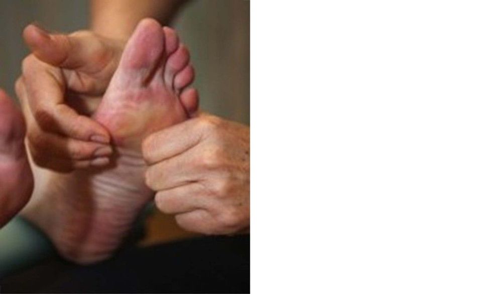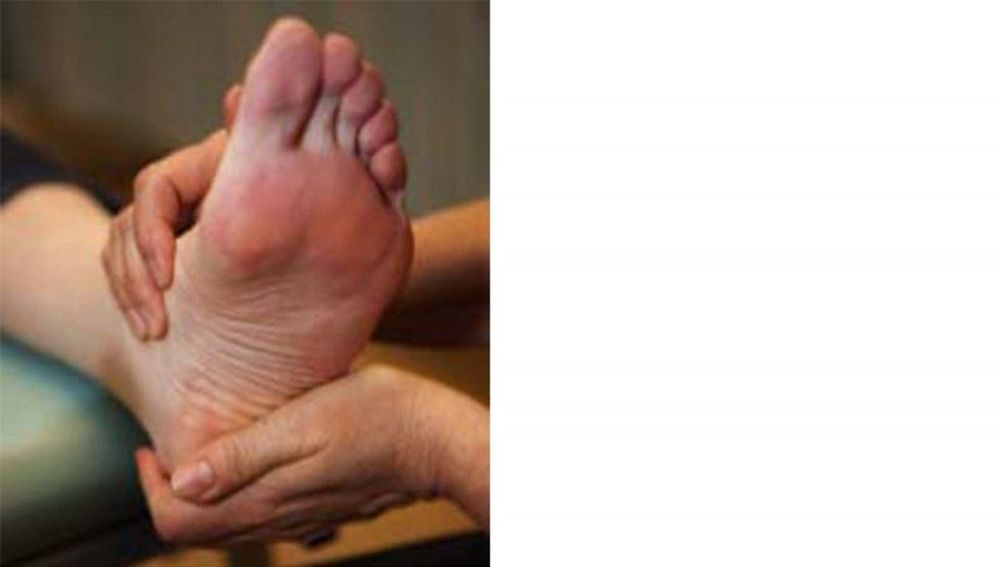 Grepp 1: Tryck utsidan av pekfingret mot mitten av fotbladet och håll om fotens ovansida med den andra handen. Fotvalvet ska liksom bli som en skål och sedan dras ut igen och bli platt.
