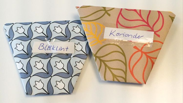Varför inte göra egna påsar att ge bort fröer i? Den här fina varianten viker du enkelt själv, utan tejp.