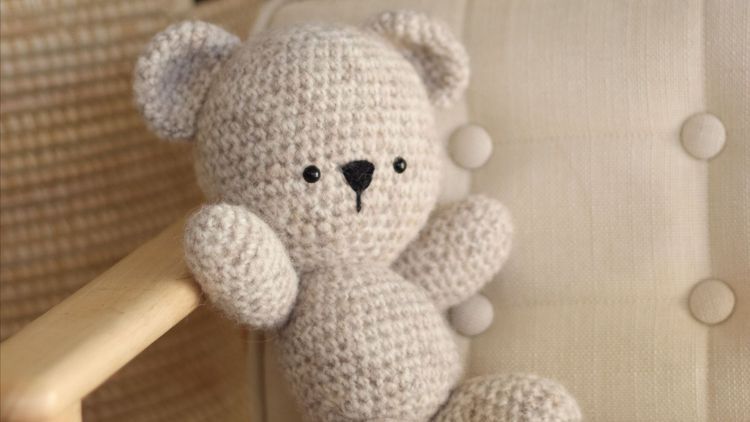 Nalle är en riktig mjukis, virkad i tunn merinoull. Mönstret kan se långt ut men är lätt att följa.