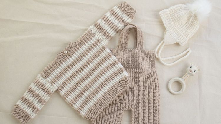 Här får du mönster på en tröja, hängselbyxa och mössa som stickas i halvpatent. Perfekt till en liten i vinter!