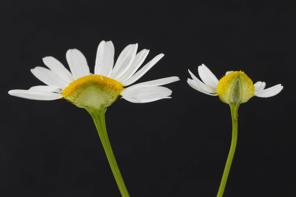 2. För att skilja baldersbrå från kamomill kan man klyva blomman och se på den gula mittknoppen. Baldersbrå har en helgjuten, platt blombotten medan kamomillen har en hög mitt med ett hålrum inuti.