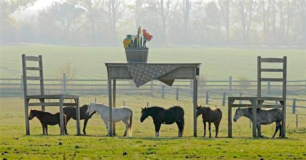 En bonde i Döllstädt i Tyskland fick inte bygga ett tak för att skydda sina hästar, hans lösning är fantastisk. Han byggde helt enkelt ett giganskt bord med två stolar. Det behövs det inget bygglov för – smart va!