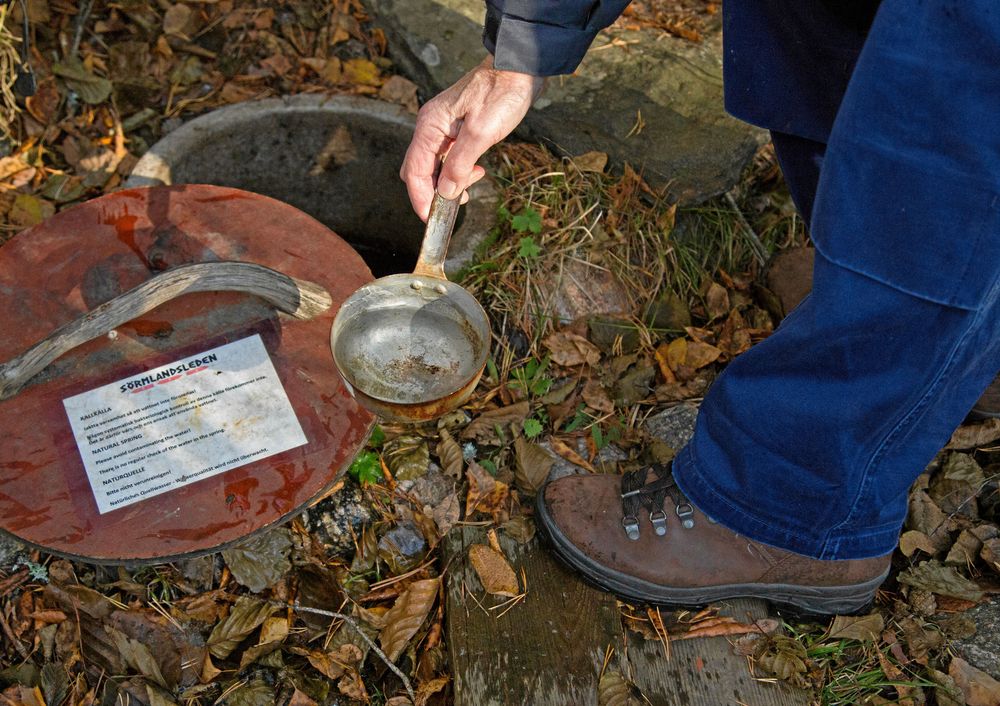 Peter stegar fram över ett dike, tar fram en metallskopa och fyller den med klart och kallt källvatten.