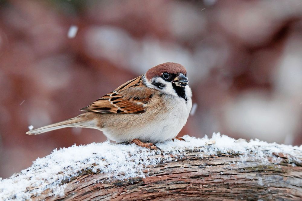 Pilfinken är en liten och livlig fågel med varmbrun rygg, grått huvud och ett tydligt svartvitt mönster på kinderna. Bröstet är blekt beige, och den korta näbben är perfekt för att knäcka frön. Pilfinken ses ofta i små flockar vid fågelbord eller bland buskar, där den rör sig snabbt och nyfiket.