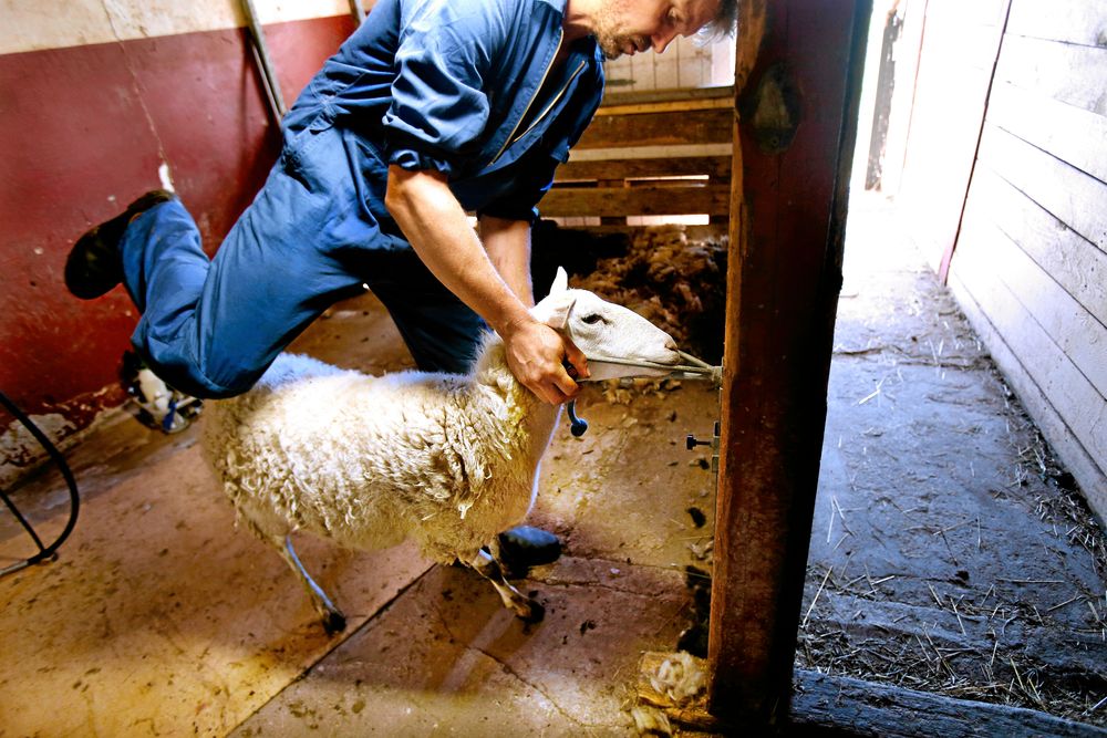 Han hämtar nästa får och sen nästa. Sätter fåret, kollar, klipper, tippar omkull och fixar fötterna. Sätter, kollar, klipper, tippar igen och igen.