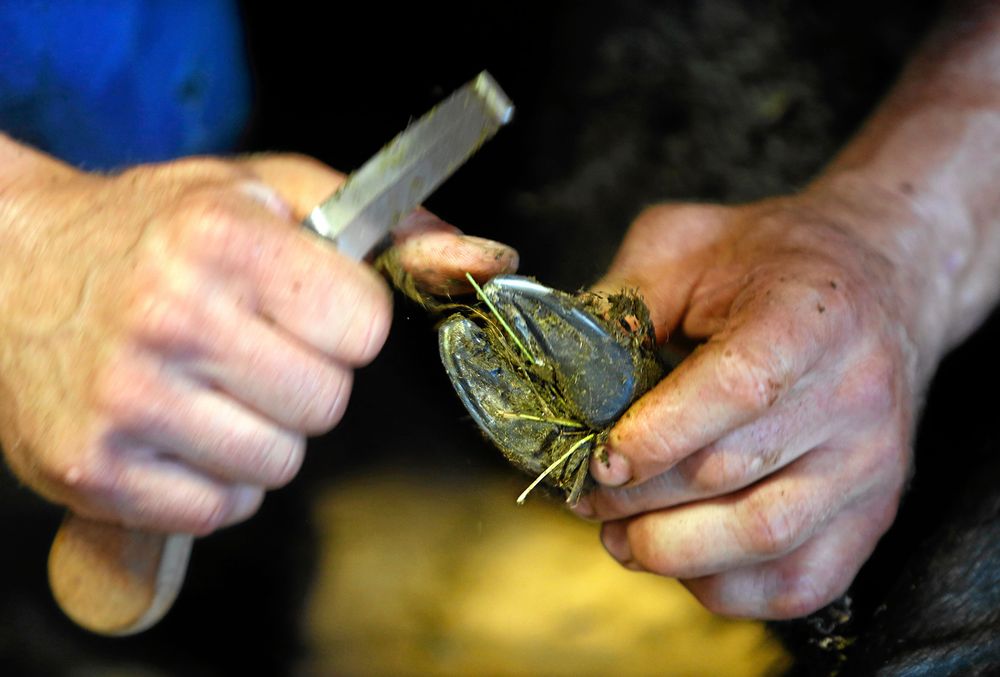 Tackan M har resignerat så till den milda grad att hon inte ens orkar stänga munnen, tungan har slunkit ut och hänger mot golvet. Det säger ”knipp, knipp” när klövarna blir rena, jämna och släta.
