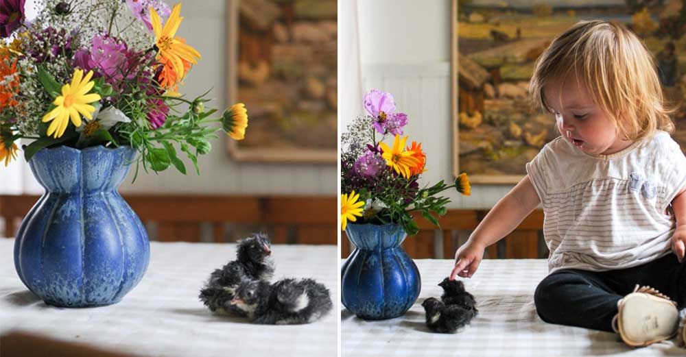 De allra första dagarna brukar hon hålla noga uppsikt över kycklingarna, och därför får de bo under en värmelampa i köket. Åtminstone de kycklingar som kläcks genom äggkläckningsmaskin och inte har någon mamma som värmer dem.
