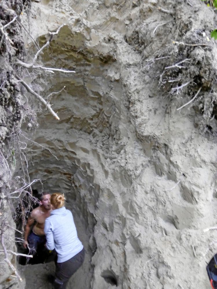 Marcus börjar smågräva för att kunna se hur grytet i den nästan lodräta slänten ligger. Nu kommer också Helena och hjälper till och tillsammans gräver de i mörkret som nu börjat falla.