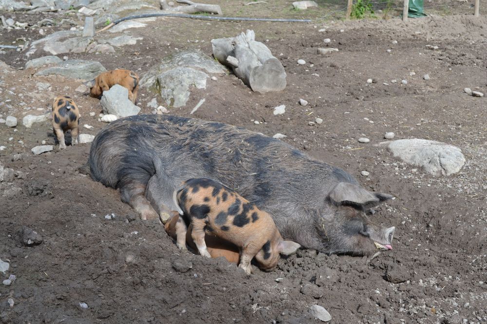 Djur: Totalt runt 170 individer av 11 raser, bl.a. rödkullekor, linderödssvin, värmlandsfår och göingeget. De ungar som inte sparas säljs som livdjur.