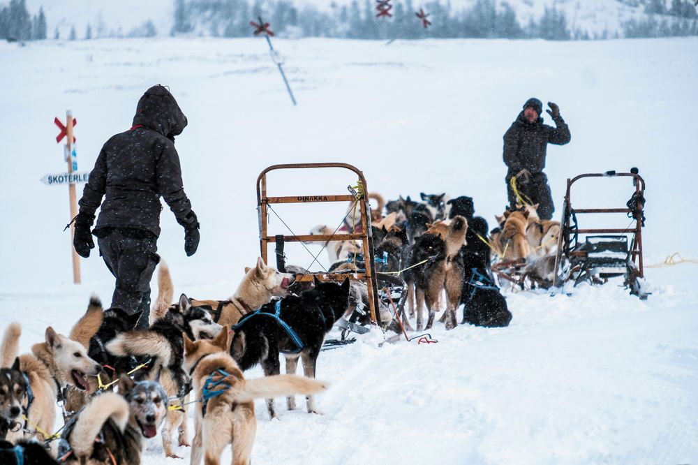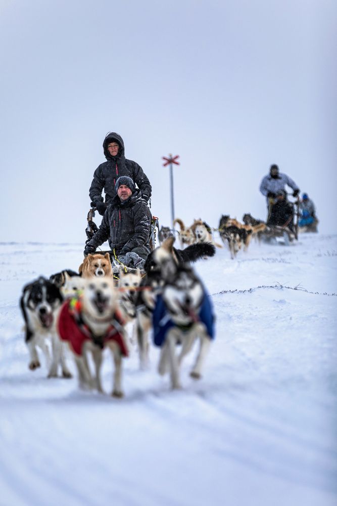 Längst fram springer de vita ledarhundarna Bella och Smulan, och snön yr om medarna när vi far fram i det vackra snölandskapet.