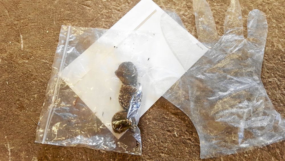 Färskt träck sätts i väl förslutna påsar och skickas in till laboratorium för analys.