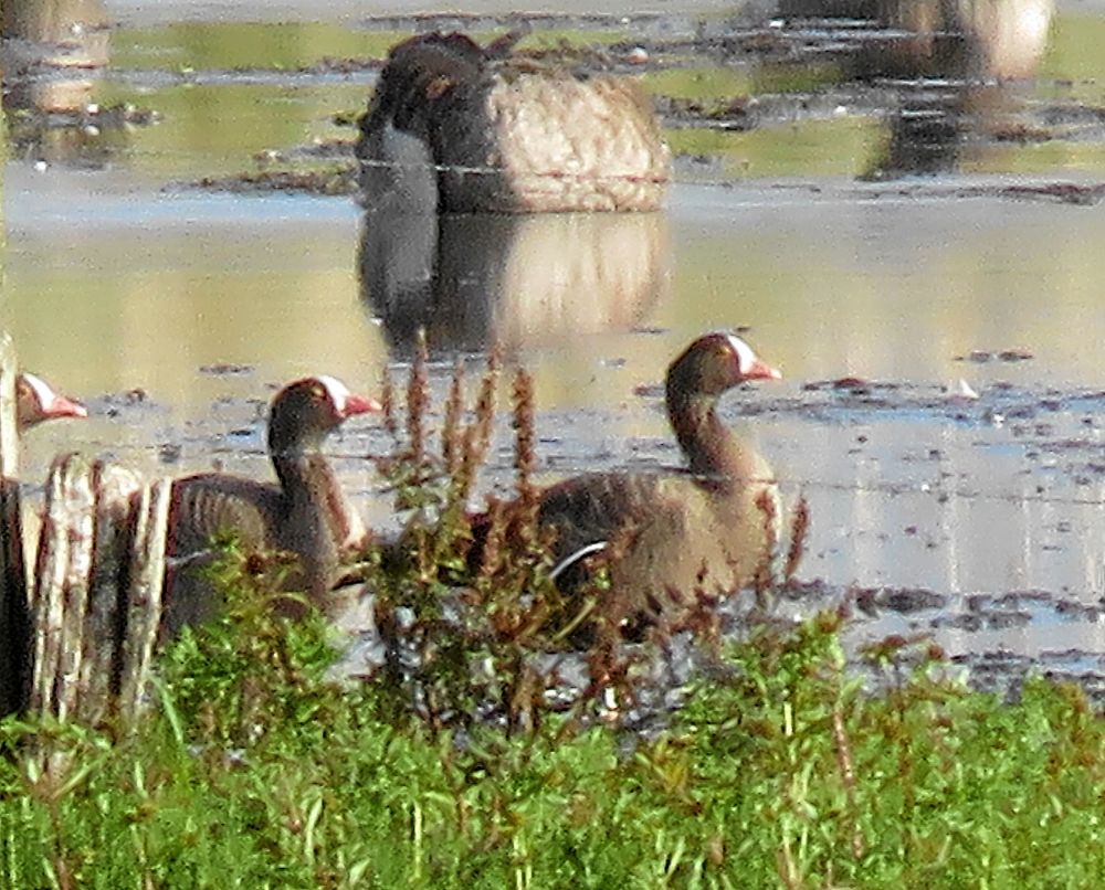Vitkindad gås, grågås och sädgås häckar i Sverige, men i princip alla vi ser här är rastande flyttfåglar. Med tubkikare nöter vi igenom de ständigt växande gåsflockarna i jakt på mer sällsynta arter. Plötsligt ropar Pekka och Kermith till och pekar.