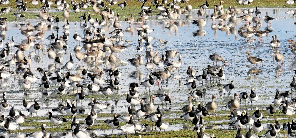 Flera tusen gäss rastade i Hjälstaviken vid Lands besök. Närmast i bilden syns framför allt vitkindade gäss och ute i vattnet står många grågäss.