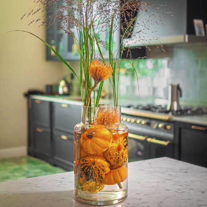 Pyttesmå dekorationspumpor är otroligt söta, ännu vackrare blir de under vatten. Lägg dem i en hög glasvas, arrangera några blommor bland dem och fyll på med vatten.