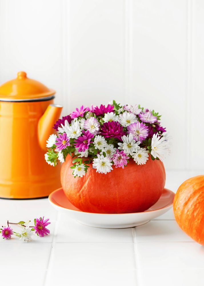 Skär av ett lock högst upp och gröp ur pumpan. Sätt sedan en glasburk inne i pumpan som kan fyllas med blommor. Det går också bra att ha en plastpåse inne i pumpan för att hålla kvar vattnet.