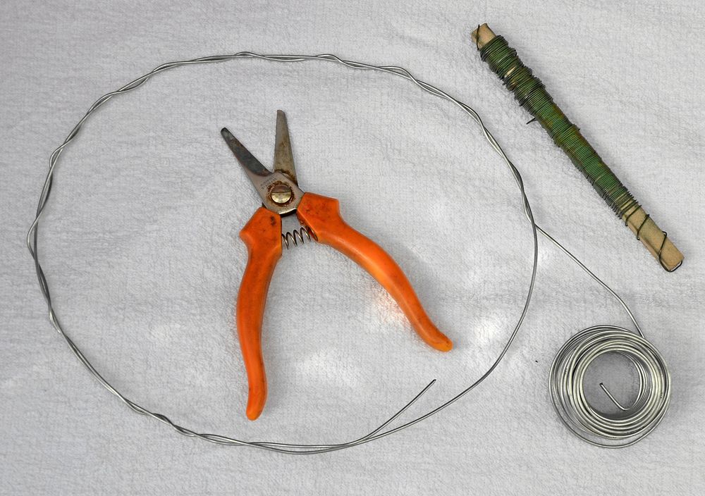 Stommen som blommorna viras fast på är najtråd från byggvaruhus säljs på liten rulle för några kronor. Du behöver också tång och grön spoltråd (som inte rostar) från hobbybutiken. Mät huvudets omkrets och forma till en ring och vira sen najtråden runt ringen så den blir dubbel