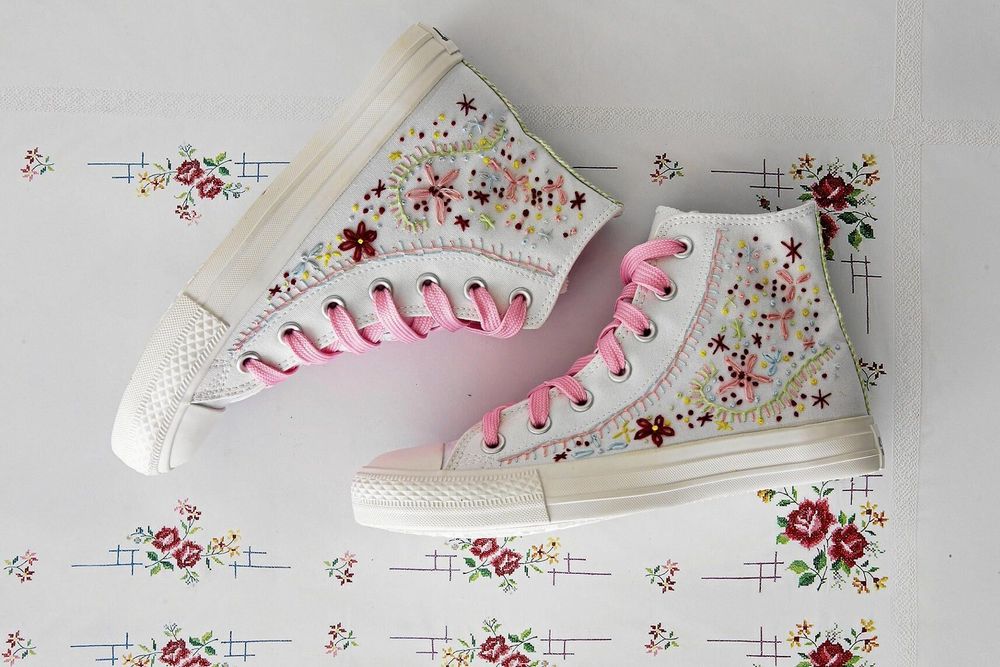 Efterstygn, franska knutar och kedjesöm ger mycket mönster för få stick med nålen. Komplettera till sist med skosnören i en matchande färg.