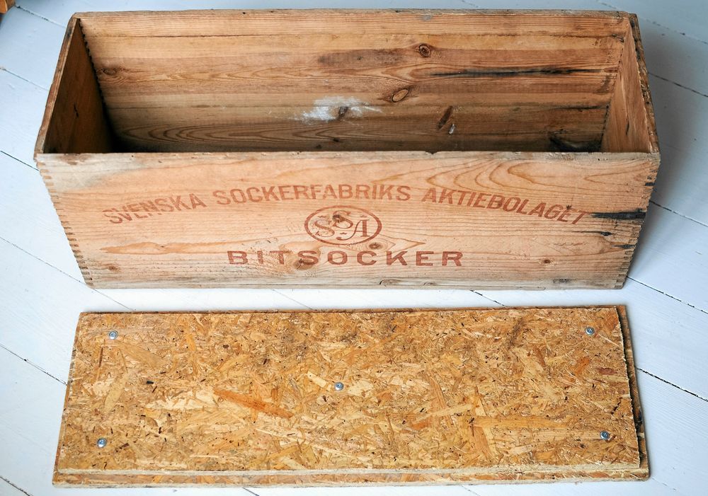 En gammal sockerlåda. Det går ju såklart att använda vilken trälåda som helst.