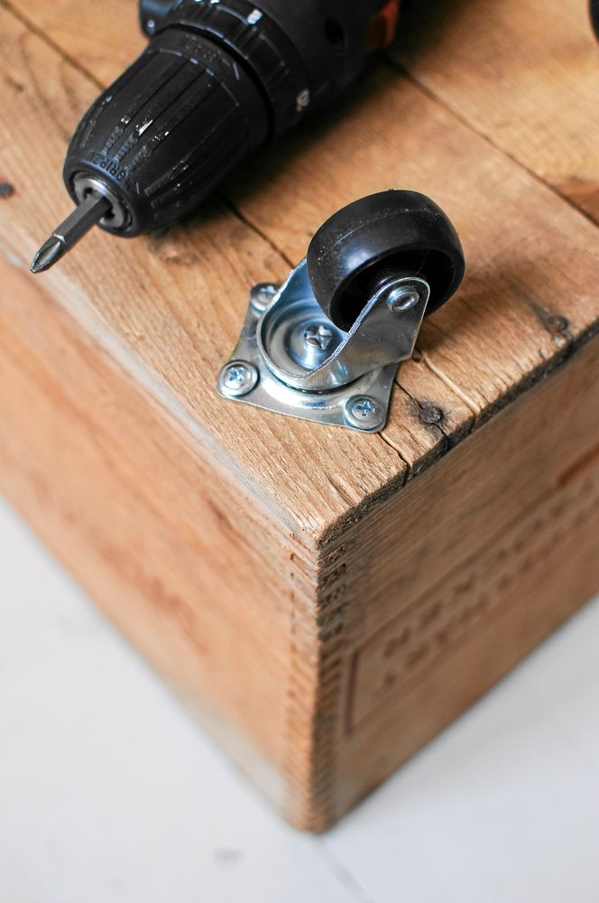 3. Skruva fast hjulen på undersidan av lådan med hjälp av skruvdragaren. Se till att skruva försiktigt så att inte träet spricker.