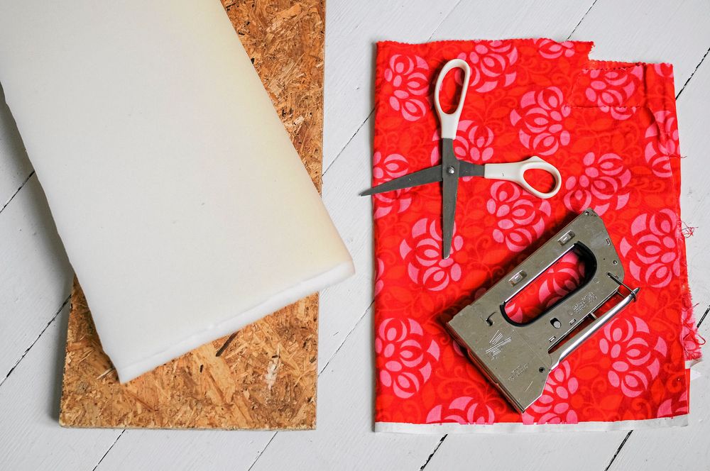 2. Rita av locket på en bit hobbyskum och skär eller klipp ut. Klipp en lagom bit tyg, lägg hobbyskummet och locket på tyget och fäst tyget runtom kanten på undersidan av locket med hjälp av häftpistolen.