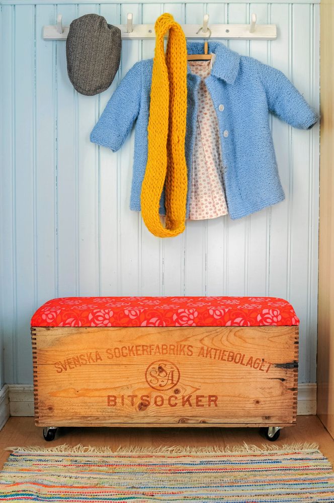 Bänk och förvaring i ett. En gammal sockerlåda från grannens garagerensning och tyg från mormors gömmor blev här en fin hallmöbel! Perfekt som förvaring till vinterns alla mössor och vantar.