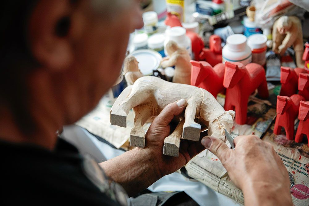 Tillsammans skapar paret figurer som berättar en historia. Hans-Göran täljer och Monica sköter färgläggningen. De täljer och målar också Svärdsjöhästen, byns egen dalahästmodell.