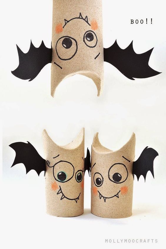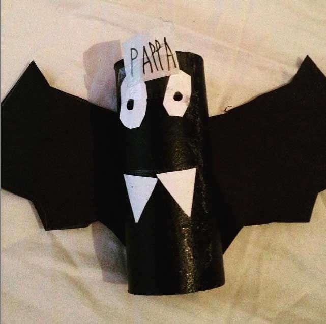 Måla en toarulle svart och limma på vita pappersögon och två vita huggtänder. Måla svarta prickar som pupiller. Klipp ut vingar av kartong som du målar svart och klistra på baksidan.