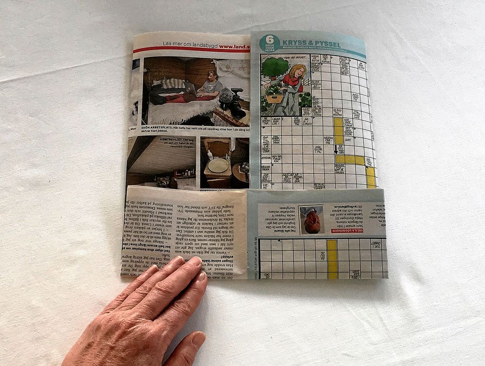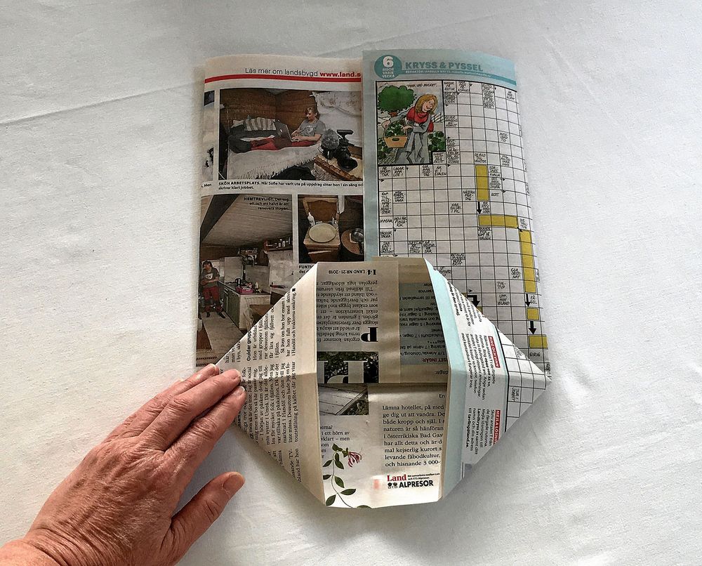 Material: En tidning och lim. Limstift, papperslim eller lite trälim blandat med lite vatten funkar bra. Det kan också vara bra att ha en klammerborttagare.