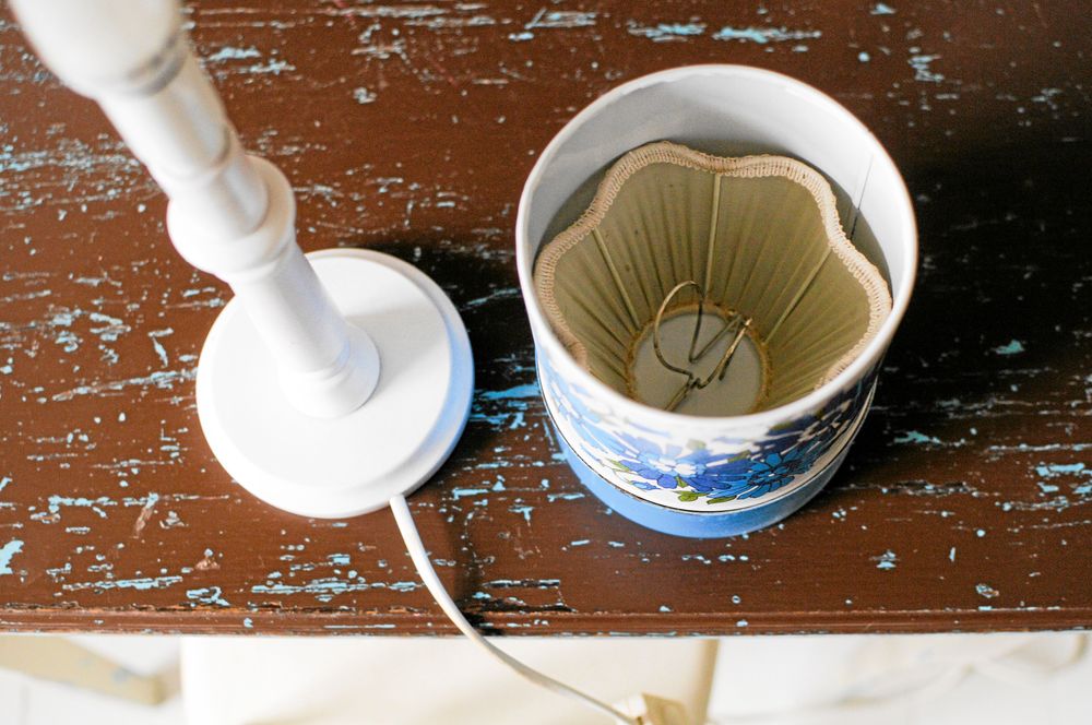 3. För att den nya skärmen skulle ha något att sättas fast i lampfoten sätts den lilla lampskärmen i tyg inuti burken. Just den här passade så fint att den fastnade men om det behövs kan skärmen limmas fast.