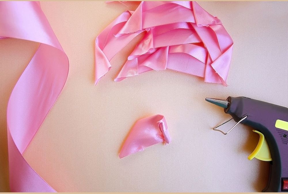 Lägg en bandbit med vikningarna nedåt och börja rulla tajt till en liten rosenknopp. Fäst med smältlim efter hand.