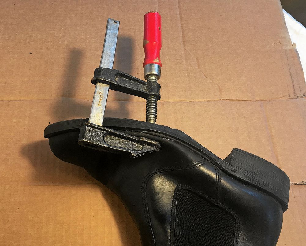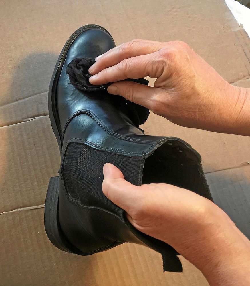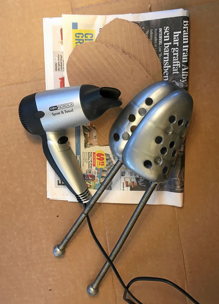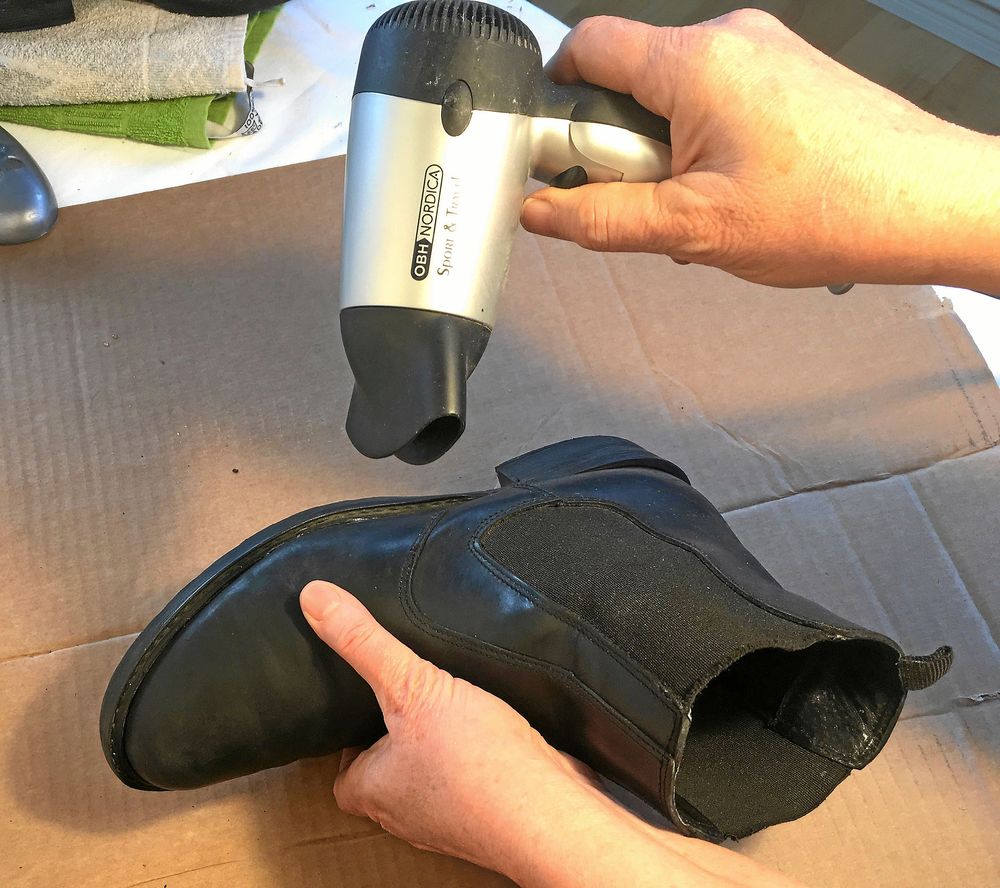 5. För att räta ut gångveck och skrynkel behövs helst ett skoblock i rätt storlek. Annars avlånga kartongbitar som läggs in i skon och trycks ut med tillknyckat tidningspapper under. Hårtork att värma med.